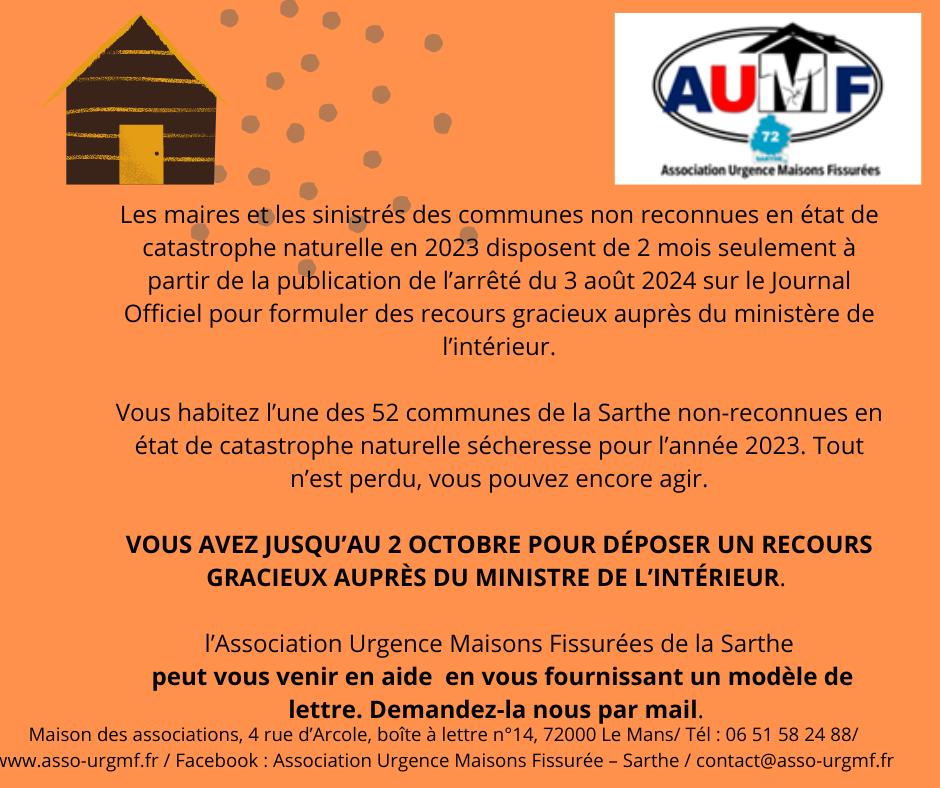 13 septembre 2024 52 communes de la Sarthe NON RECONNUES en état de catastrophe naturelle (Mouvements de terrain différentiels consécutifs
