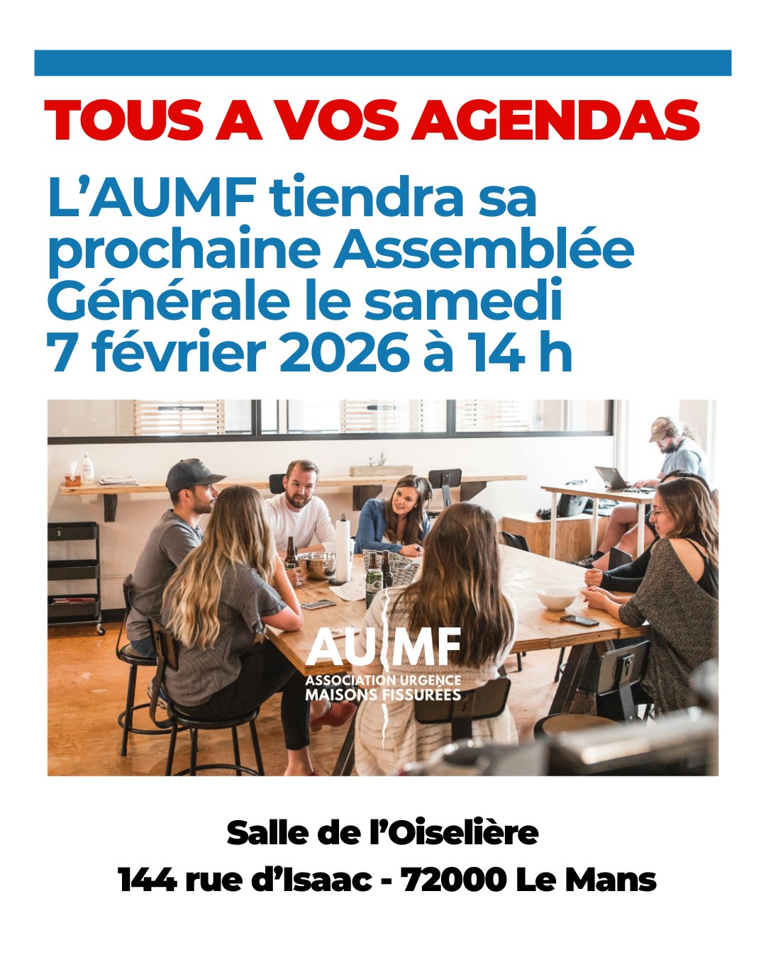 TOUS A VOS AGENDAS : PROCHAINE ASSEMBLÉE GÉNÉRALE DE L’AUMF LE 7 FEVRIER 2026 L’Association Urgence Maisons Fissurées (AUMF) convie l’ensemble de ses adhérents, partenaires et soutiens à sa prochaine Assemblée Générale qui se Lire l'article